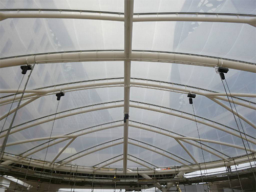 ETFE膜使用壽命至少為25-35年,是用于永久性多層可移動屋頂結(jié)構(gòu)的理想材料。該膜材料多用于跨距為4米的兩層或三層充氣支撐結(jié)構(gòu),也可根據(jù)特殊工程的幾何和氣候條件,增大膜跨距。膜長度以易安裝為標(biāo)準(zhǔn),一般為15-30米。小跨度的單層結(jié)構(gòu)也可用較小規(guī)格。